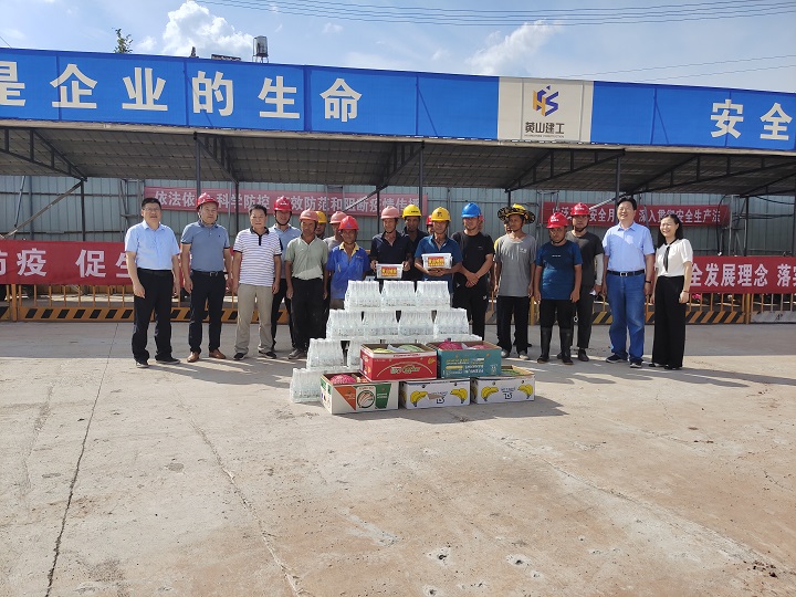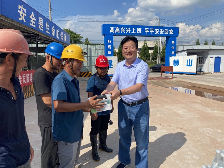 7月21上午,業(yè)主單位黃山市城投集團(tuán)黨委書記、董事長陳杰、總裁黃世穩(wěn)等一行分組帶隊(duì)到我公司承建的黃山市危險(含醫(yī)療)廢物集中處置中心易地重建工程、黃山市南部城鎮(zhèn)群水務(wù)調(diào)度中心項(xiàng)目、黃山生豬定點(diǎn)屠宰加工及配套設(shè)施項(xiàng)目及配套冷鏈項(xiàng)目施工現(xiàn)場送來了人丹、十滴水、礦泉水、西瓜等防暑降溫用品,并向奮戰(zhàn)在一線的施工人員及項(xiàng)目部管理人員表示了親切的慰問和感謝,對一線人員頭頂烈日不畏酷暑的精神給予了贊揚(yáng)。