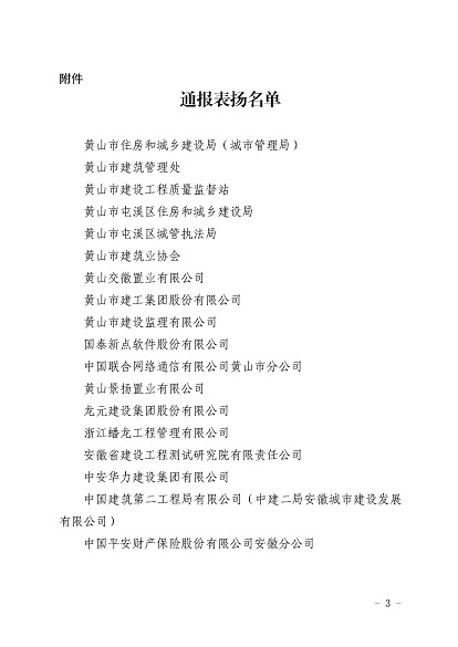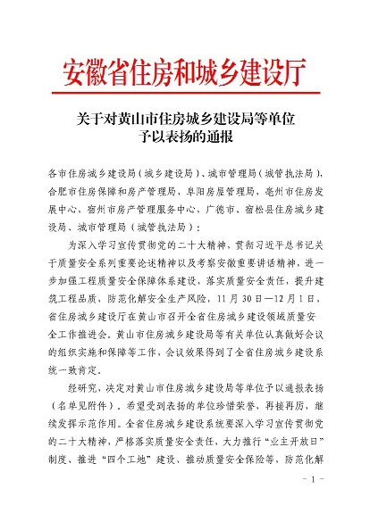 近日,安徽省住房和城鄉(xiāng)建設(shè)廳印發(fā)《關(guān)于對(duì)黃山市住房和城鄉(xiāng)建設(shè)局等單位予以表?yè)P(yáng)的通報(bào)》,《通報(bào)》指出,11月30日-12月1日,省住房和城鄉(xiāng)建設(shè)廳在黃山市召開全省住房建設(shè)領(lǐng)域質(zhì)量安全工作推進(jìn)會(huì),會(huì)議效果得到全省住房城鄉(xiāng)建設(shè)系統(tǒng)一致肯定,并對(duì)在此次會(huì)議認(rèn)真做好組織實(shí)施和保障的單位予以通報(bào)表?yè)P(yáng),黃山市建工集團(tuán)股份有限公司作為唯一一家本土建筑施工企業(yè)榮獲表?yè)P(yáng)。