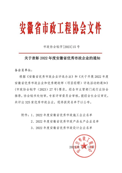 近日,安徽省市政工程協(xié)會(huì)公布了“2022年度安徽省優(yōu)秀市政施工企業(yè)”名單。黃山建工集團(tuán)股份有限公司被安徽省市政協(xié)會(huì)評(píng)為“2022年度安徽省優(yōu)秀市政企業(yè)”。該項(xiàng)榮譽(yù)是由各市主管部門或行業(yè)協(xié)會(huì)推薦,經(jīng)省市政協(xié)會(huì)秘書處初審,專家評(píng)審委員會(huì)審核,安徽省市政工程協(xié)會(huì)最終審定。
