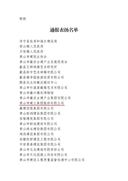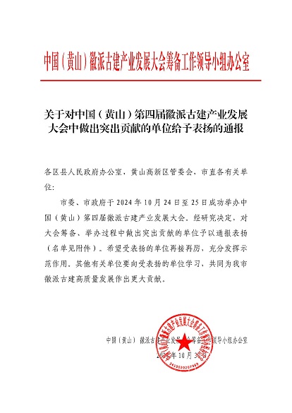 市委、市政府于2024年10月24日至25日成功舉辦中國(黃山)第四屆徽派古建產(chǎn)業(yè)發(fā)展大會。近日,中國(黃山)徽派古建產(chǎn)業(yè)發(fā)展大會籌備工作領(lǐng)導(dǎo)小組辦公室發(fā)布《關(guān)于對中國(黃山)第四屆徽派古建產(chǎn)業(yè)發(fā)展大會中做出突出貢獻(xiàn)的單位給予表揚的通報》,黃山建工集團榮列其中。